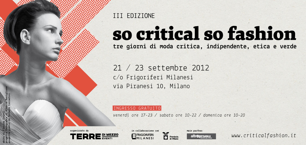 So Critical So Fashion, nato nel 2010 e giunto alla 3^ edizione è il primo evento in Italia interamente dedicato ad un’ “altra moda”, fatta di saperi e principi etici, di tessuti biologici e tagli sartoriali, di prodotti a basso impatto ambientale, creati da designer all’avanguardia e stilisti indipendenti. Giunto alla sua terza edizione, organizzato da Terre di Mezzo Eventi, si conferma come l’appuntamento di riferimento della moda critica all’interno della Milano Fashion Week.