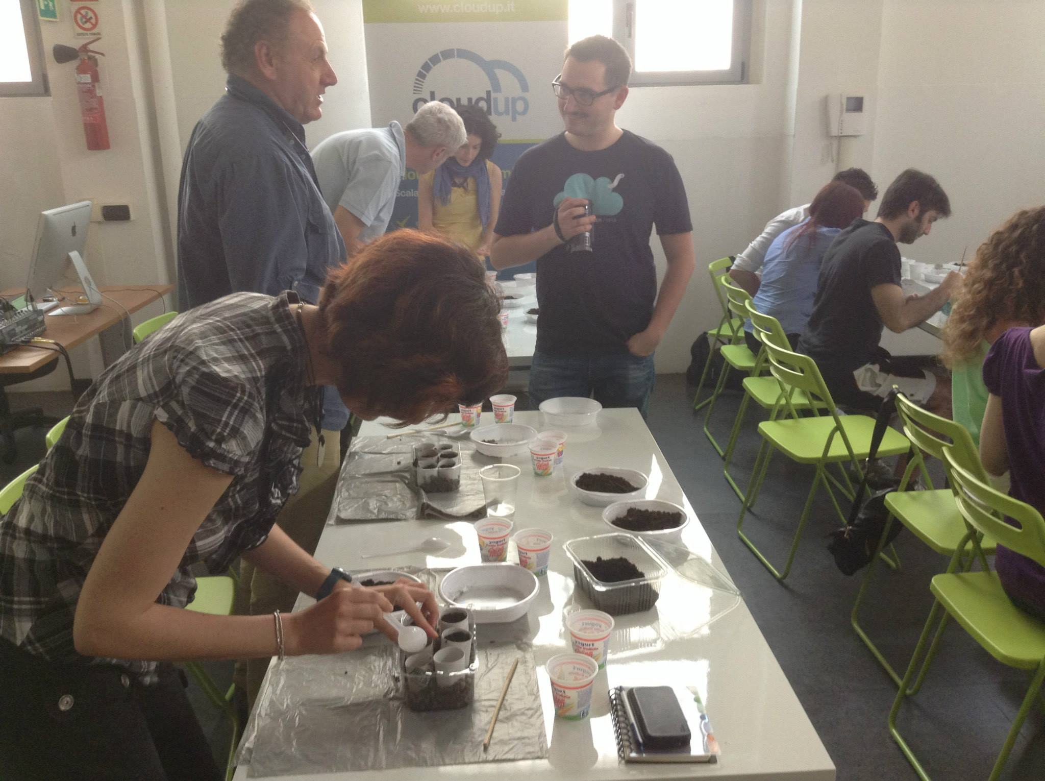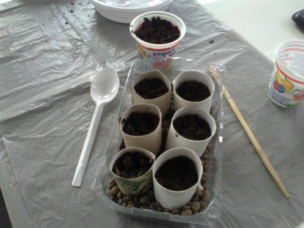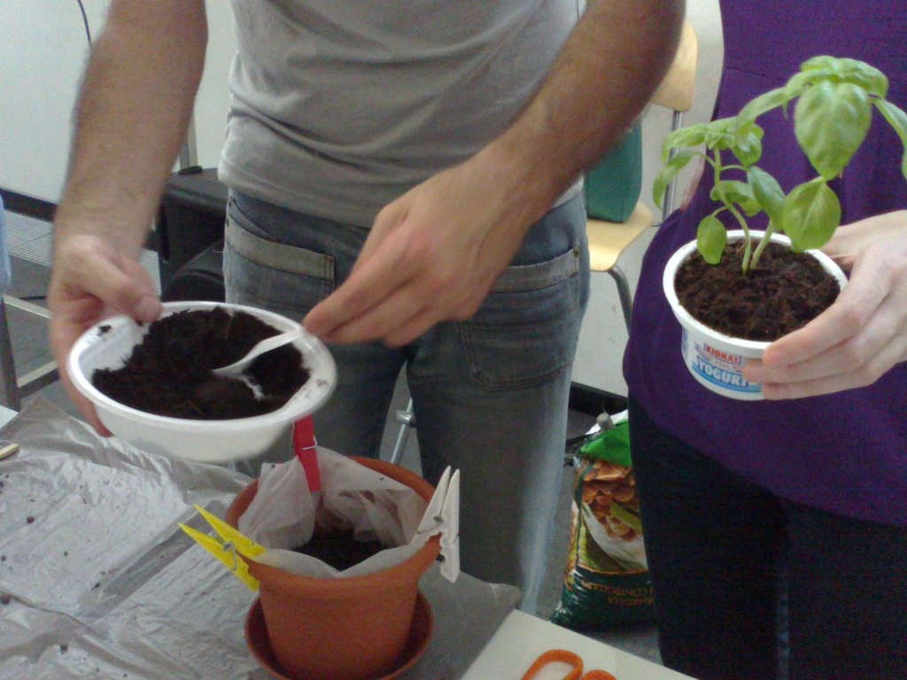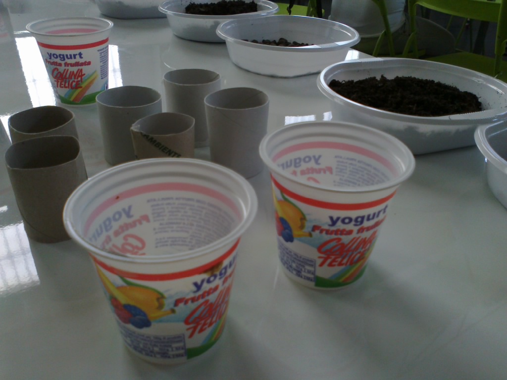 Si utilizzano dei materiali di scarto: vasetti vuoti dello yogurt, cartone del rotolo di carta igienica, vasetti di minestra pronta che sembrano vasi veri e questo è già un inizio ecologico. Poi occorre della buona terra e delle palline di argilla e si può cominciare. Dopo aver sistemato una base di argilla nel contenitore di plastica, si aggiunge la terra concimata e poi i semi di ciò che si vuole coltivare. Qui ne avevamo disposizione parecchi: pomodori, lattuga, basilico, prezzemolo, lavanda e altri ancora. Alla fine si annaffia e il nostro semenzaio da scrivania è pronto.