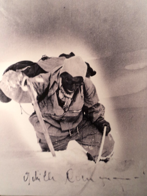 Ma sono le attrezzature che mi hanno impressionato più di tutto: i primi esempi di ciaspole, gli sci in legno, una valigia da portare con sé, ma solo fino al campo base che poi si va a salire con uno zaino in spalla. La tenda arancione, diventata allora famosa, che sembra così leggera ed è quasi impossibile per me pensare che sia ancora intera, dopo i venti, le nevi e il ghiaccio di oltre ottomila metri sul livello del mare. Per non dire poi di come un essere umano possa sopravvivere lì dentro. E  il sacco a pelo, che sembra così inconsistente e i calzini di lana con gli scarponi fatti su misura. Ci giro e ci rigiro attorno. Mi chiedo come sia possibile resistere, a quel freddo, a quei venti a quelle altezze.