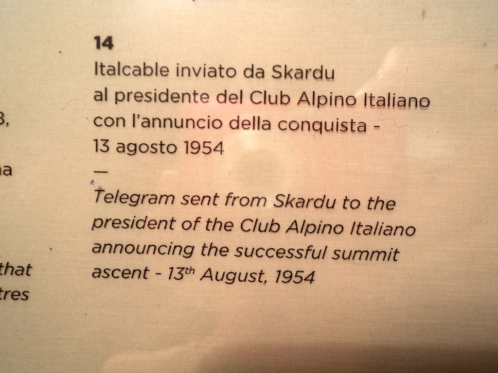 Ho ammirato le foto in bianco e nero e le prime pagine dei giornali del 1954, data della conquista della seconda vetta più alta al mondo, il K2 (8611m) da parte di Achille Compagnoni e Lino Lacedelli. E il telegramma inviato per dire della conquista della vetta, e ancora, lì vicine, la piccozza e la bandiera italiana che hanno sventolato a quelle altezze.