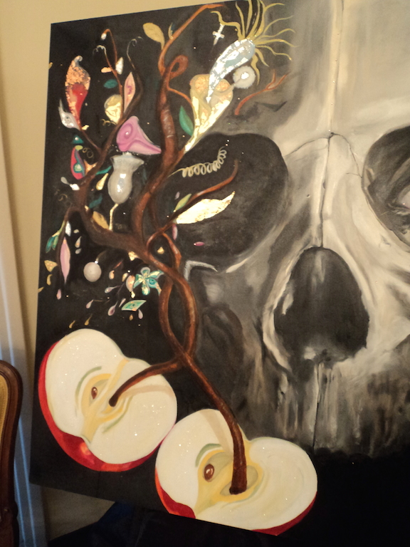 La mela rossa, aperta in due, dai semi crescono direttamente tronchi d’albero che a loro volta portano fiori, calle colorate e foglie dorate. Come una crescita veloce e repentina, dal seme all’albero, senza passare per germogli verdi e teneri.