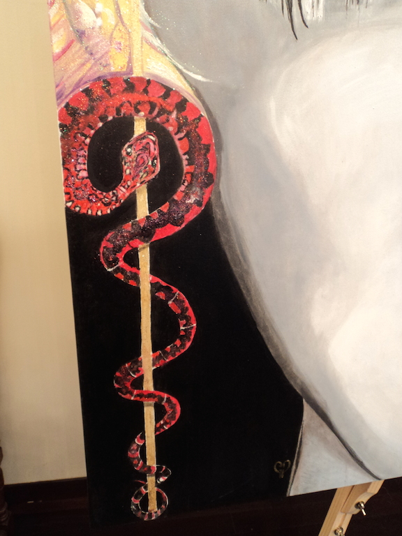 Il serpente rosso e nero, nei colori forti che indicano al predatore di stare attento perché potrebbe essere un animale velenoso. Il serpente che richiama la tentazione e il paradiso perduto e forse il sogno impossibile di poter tornare indietro nel passato.