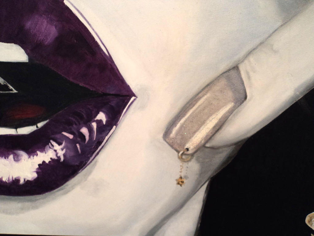 Il viola cupo delle labbra accanto all’oro dello smalto sull’unghia rappresentati alla perfezione.
