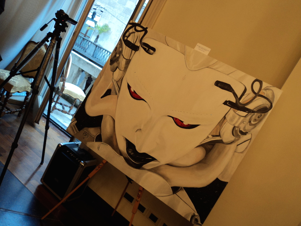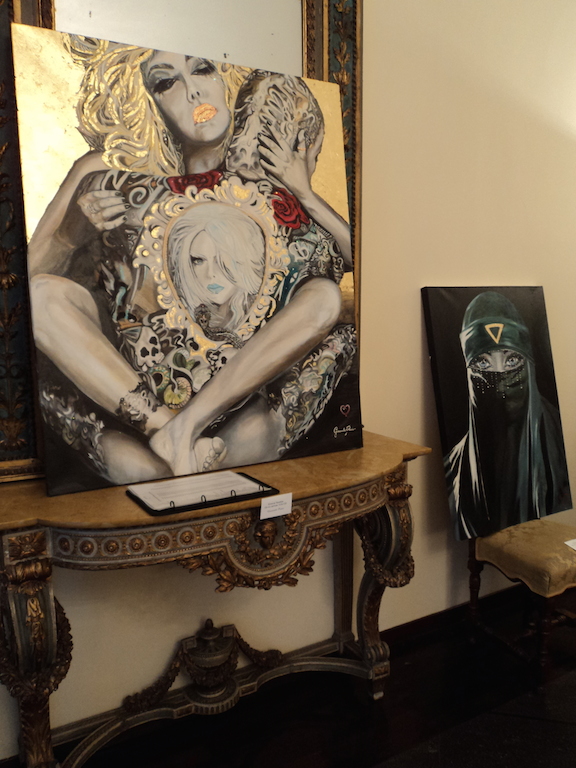 Bellissimo anche il quadro “Medusa” sullo sfondo vicino all’artista: Giancarla (che ringrazio e saluto) molto simpatica, gentile e aperta verso tutti, una “Jessica Rabbit” più che mai viva nel bellissimo abito dorato con fantastiche e vertiginose scarpe rosse, che mi ha lasciato fotografare per le sale e mi ha autografato il suo catalogo