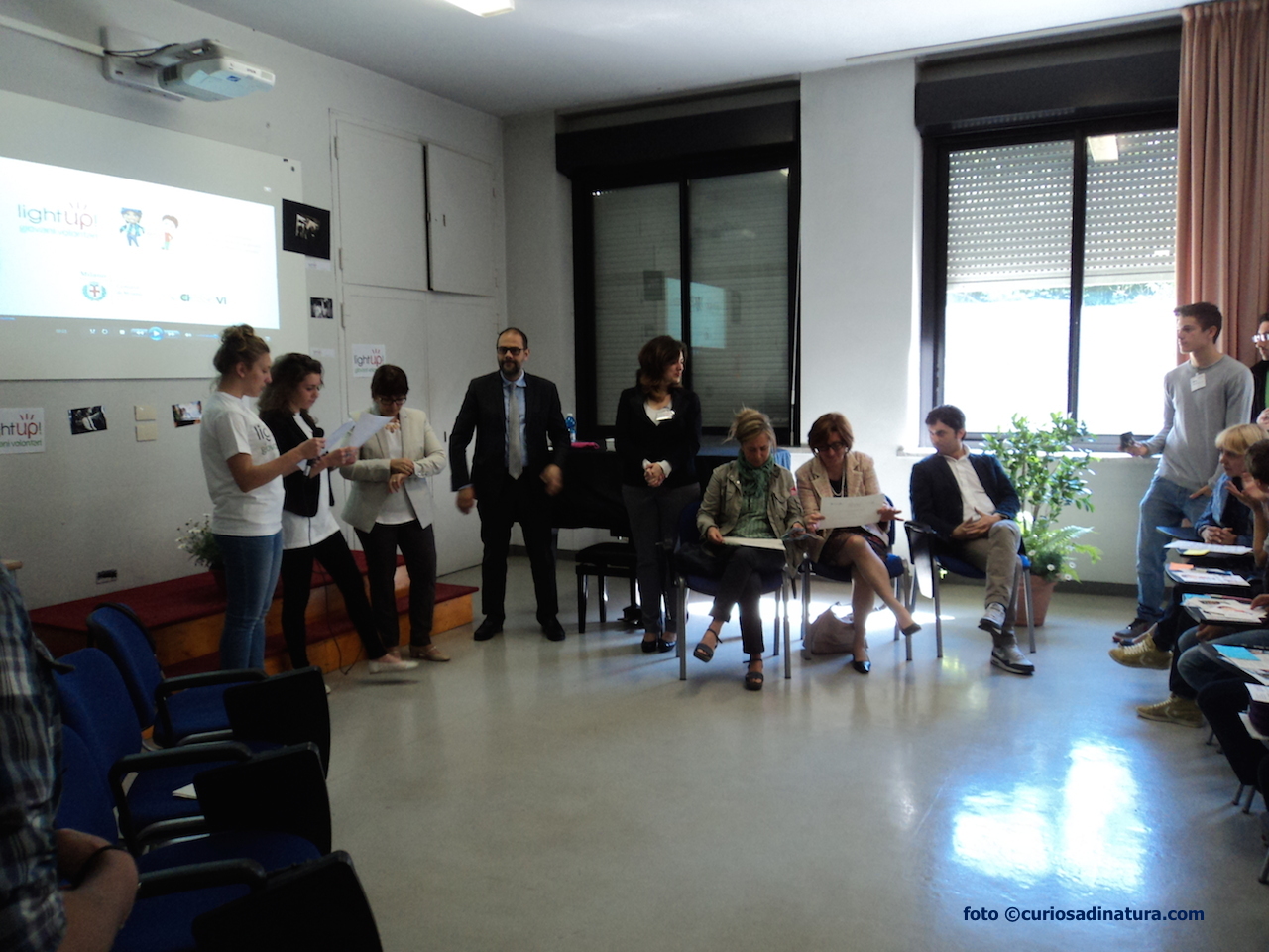 Poi una breve pausa e tutti di nuovo in Aula Magna. Qui le video clip vengono caricate sul pc ufficiale. Nel frattempo alcuni gruppi raccontano le loro idee di fare un “flash mob”. Altri hanno già realizzato un ottimo video, di 1 minuto, come da regolamento, che viene direttamente inviato al concorso (tra questi c’è anche il video del gruppo di Andrea, ad esempio). Una volta raccolti tutti i video, qualcuno viene proiettato in aula e devo dire che le idee sono davvero belle, divertenti e comunicano una grande voglia di fare volontariato e di aiutare chi ha bisogno.