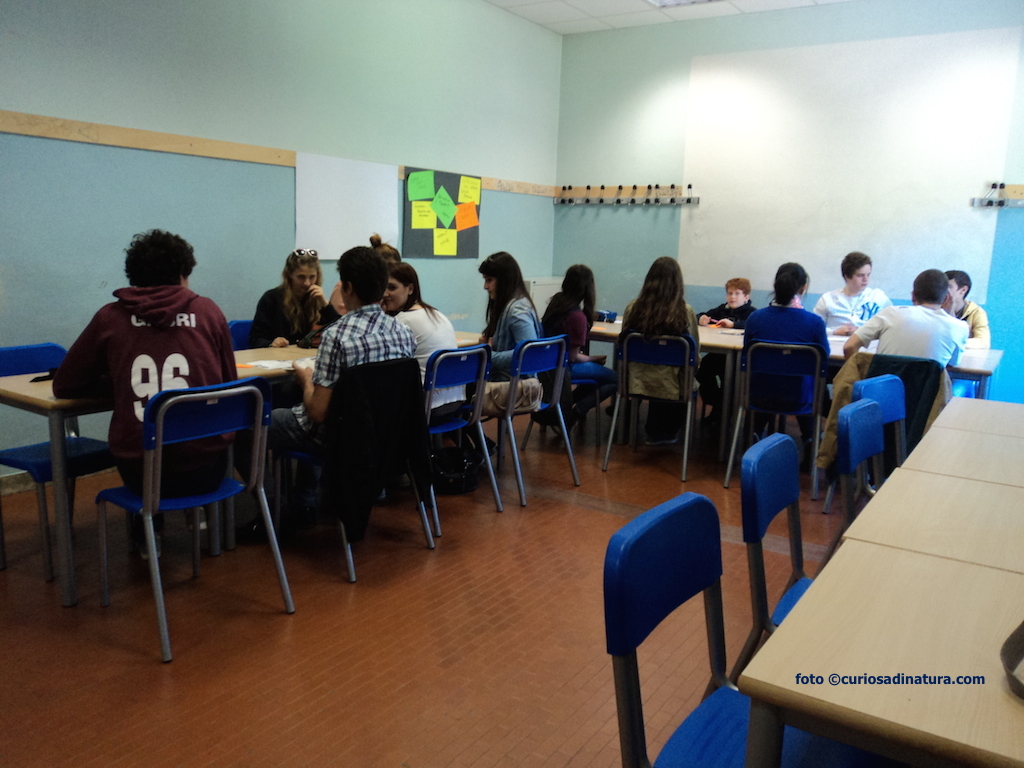 Alice e il suo gruppo vanno in giardino, Elisabetta e compagni in un’altra aula dell’istituto. Andrea e i suoi mi chiedono di dare una mano a girare il video e accetto volentieri.
