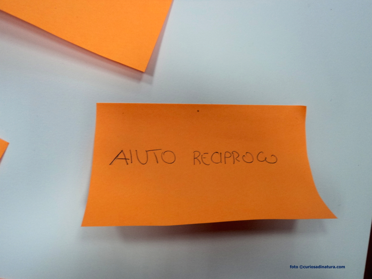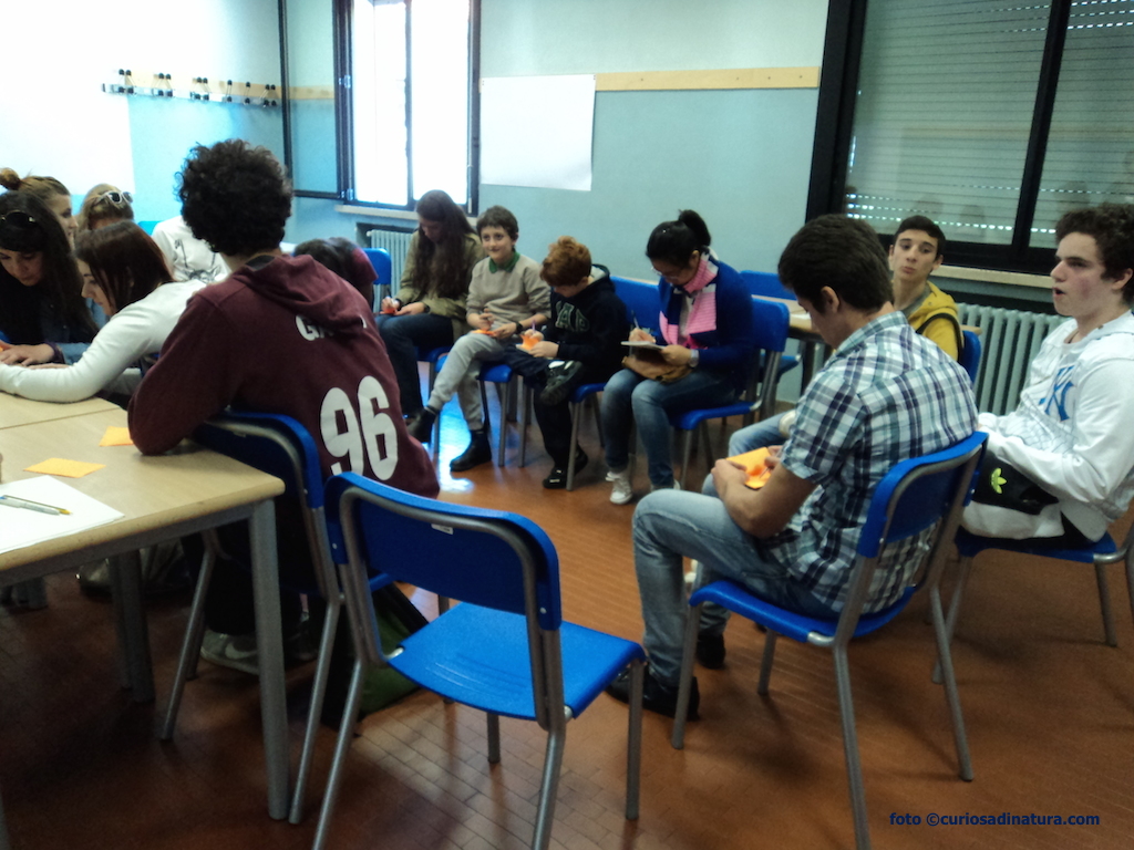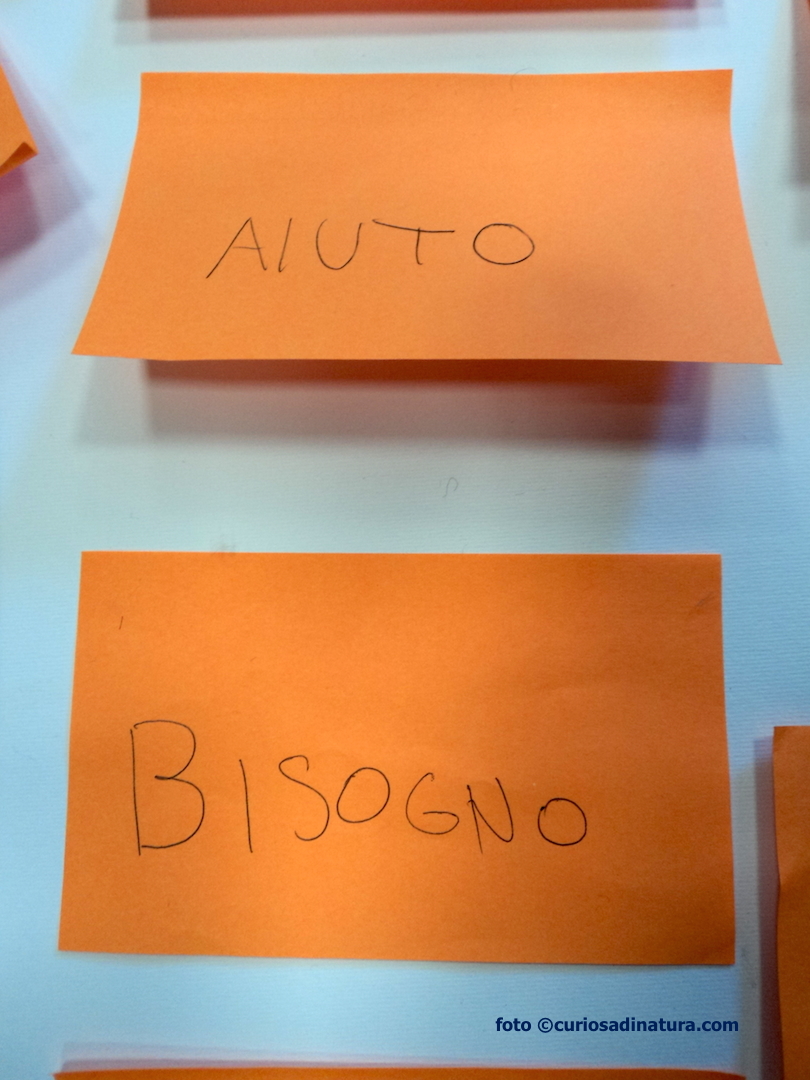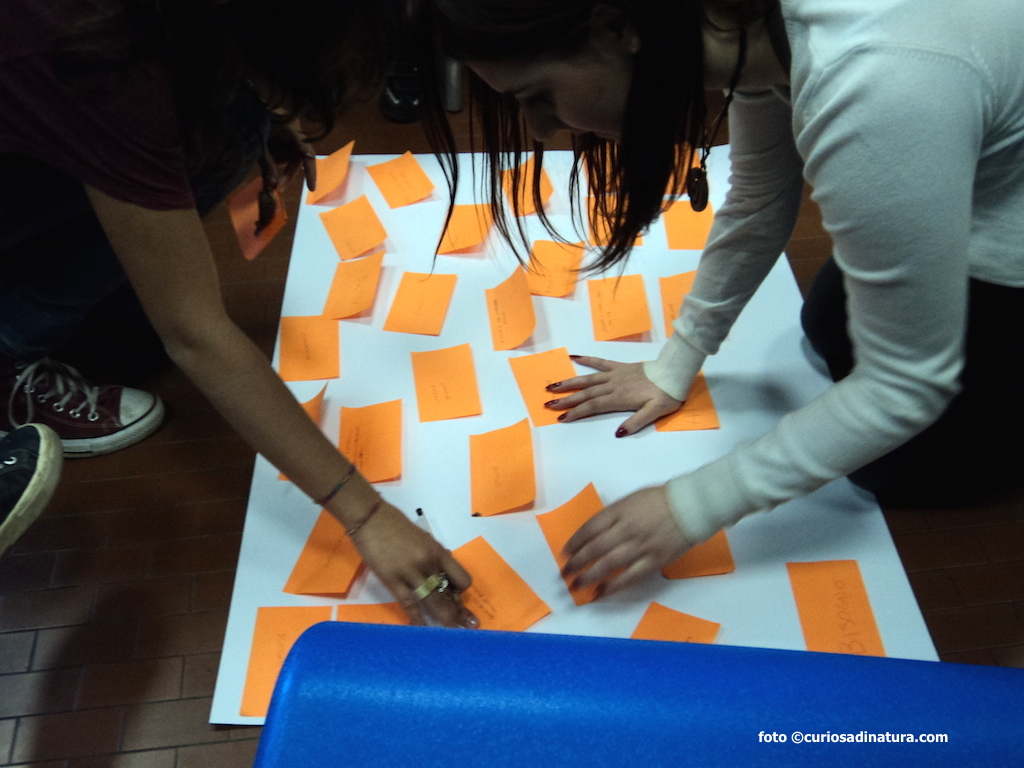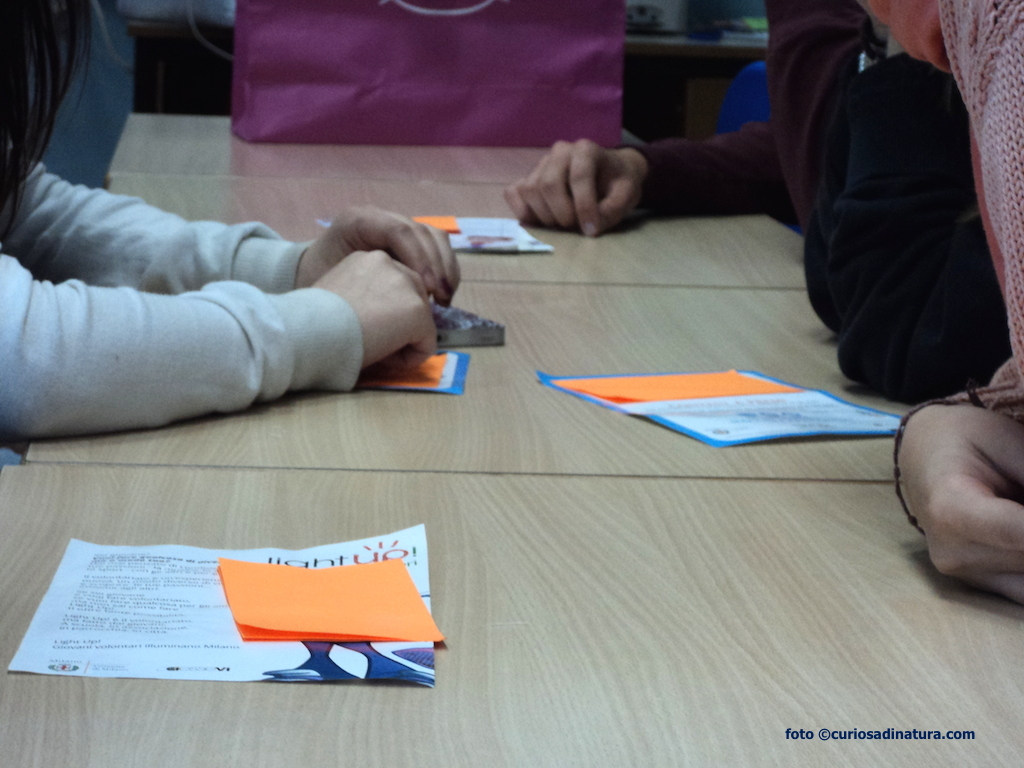 All’arrivo, i ragazzi hanno scelto a caso un post-it colorato. Dopo i saluti istituzionali, i partecipanti sono stati divisi in gruppi in base al colore del post-it che ciascuno aveva scelto. Decido (anche io puramente a caso) di seguire il gruppo dei post-it color arancione, guidato nelle attività da Marina del Ciessevi.