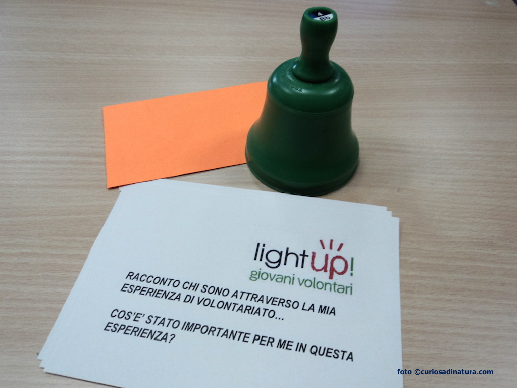 Nell’aula si comincia con uno “speed date” particolare: 3 minuti a coppia per raccontarsi le proprie esperienze di volontariato, in un tempo scandito dalla campanella verde di Marina e poi via, si cambia compagno, a rotazione.