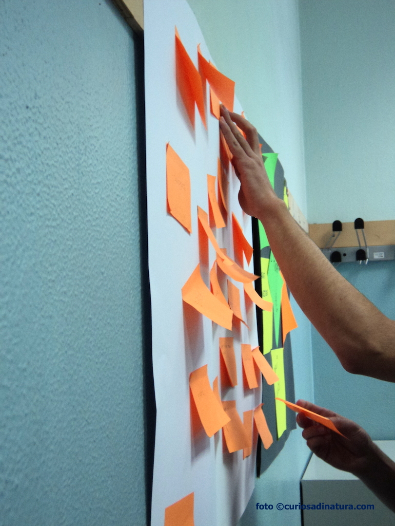 Tutti i post-it sono attaccati sul cartellone bianco, che poi viene messo a terra e i foglietti raggruppati per concetti simili.