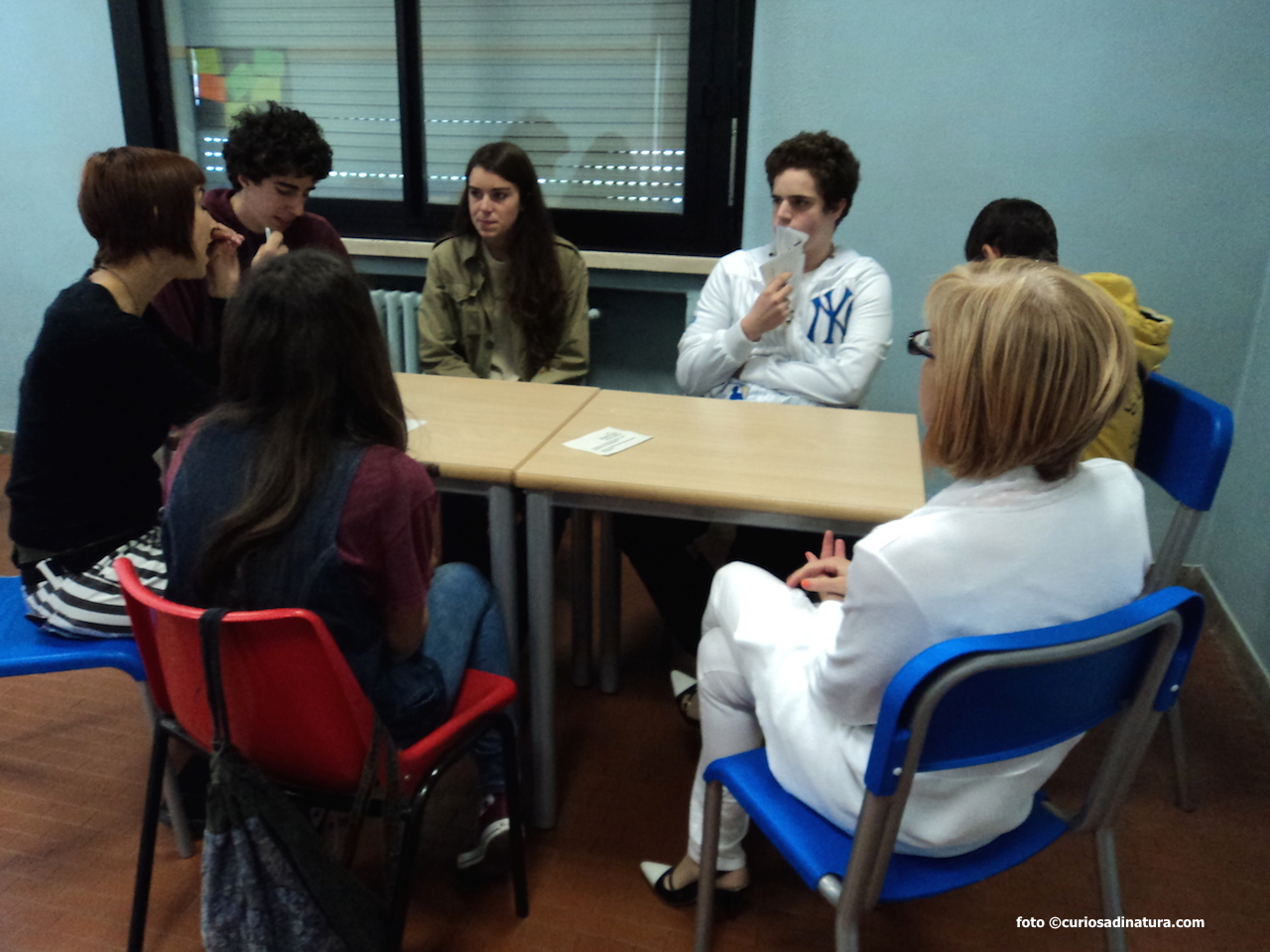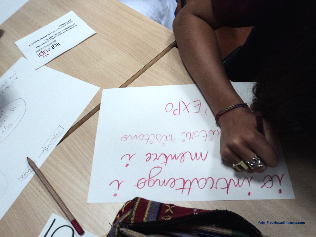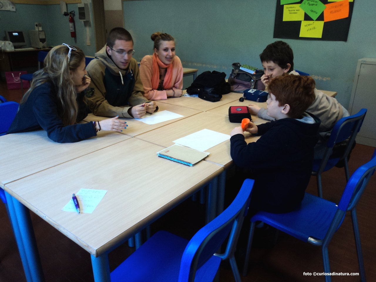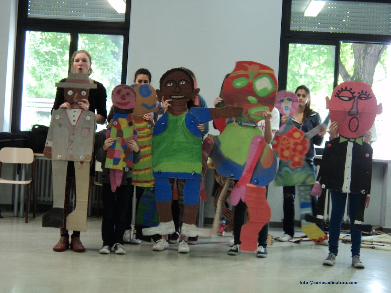 Tutti fuori dall’Aula Magna, ci incamminiamo verso l’aula che ci è stata assegnata per lavorare. Il gruppo è davvero interessante: 7 ragazze e 7 ragazzi dai 7 ai 17 anni.