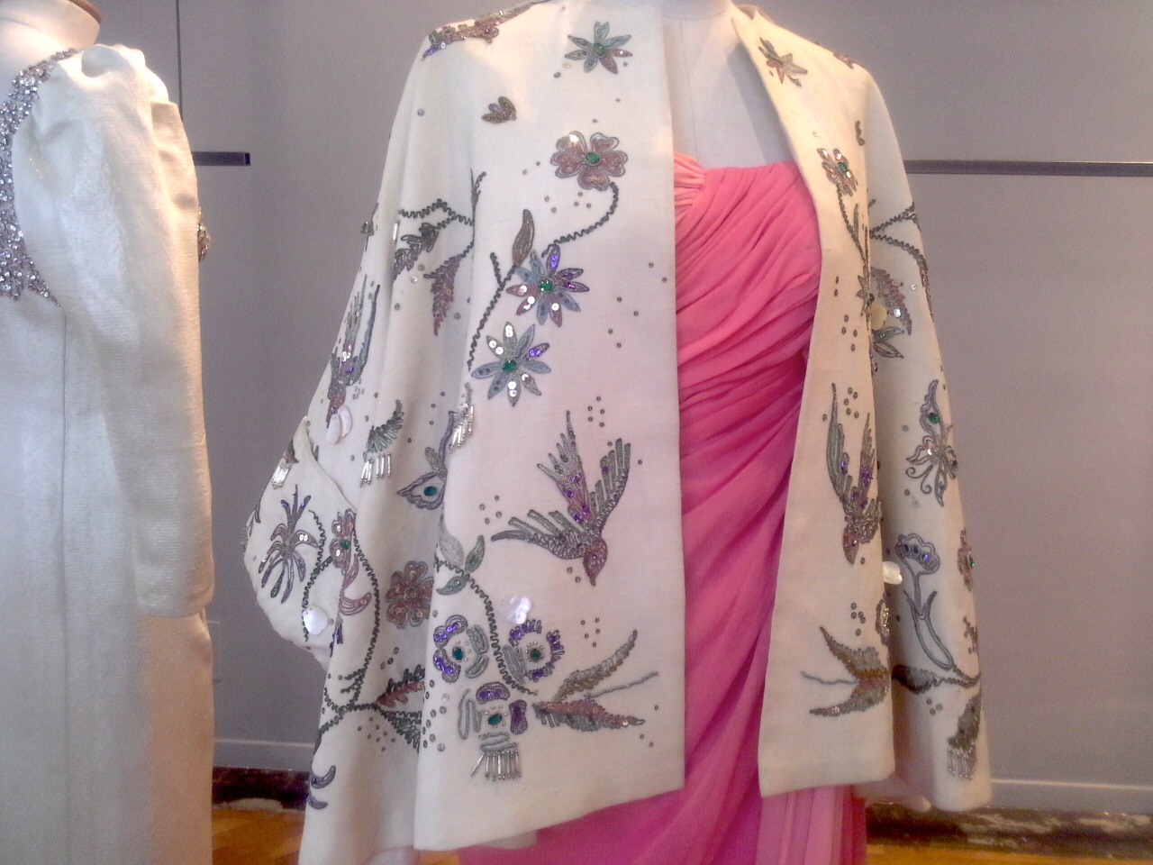 1. La mostra “I grandi sarti italiani e quell’ineffabile desiderio di bellezza” ripropone vestiti unici, creati da esperte sartorie italiane. Tra questi, tutti bellissimi, la natura prevale nell’abito Anni ’50 delle sorelle Calabresi di Firenze con rondini e fiori e in quello di Stop Sèmés di Roma degli Anni ’70 che ripropone bellissimi fiori ricamati.