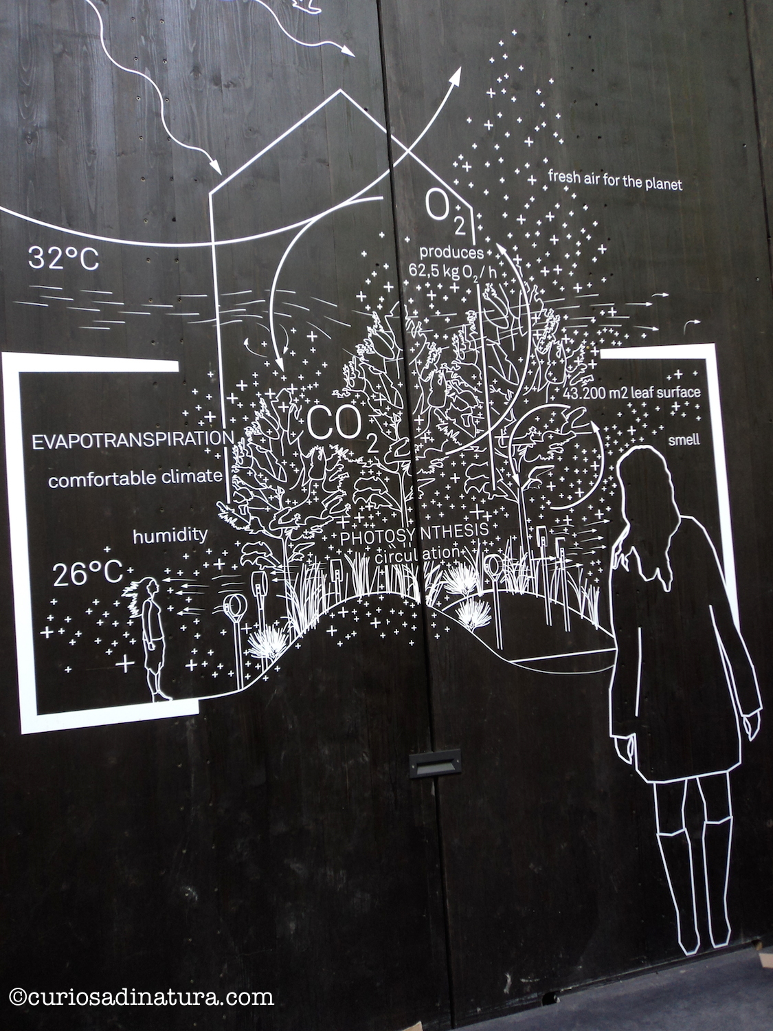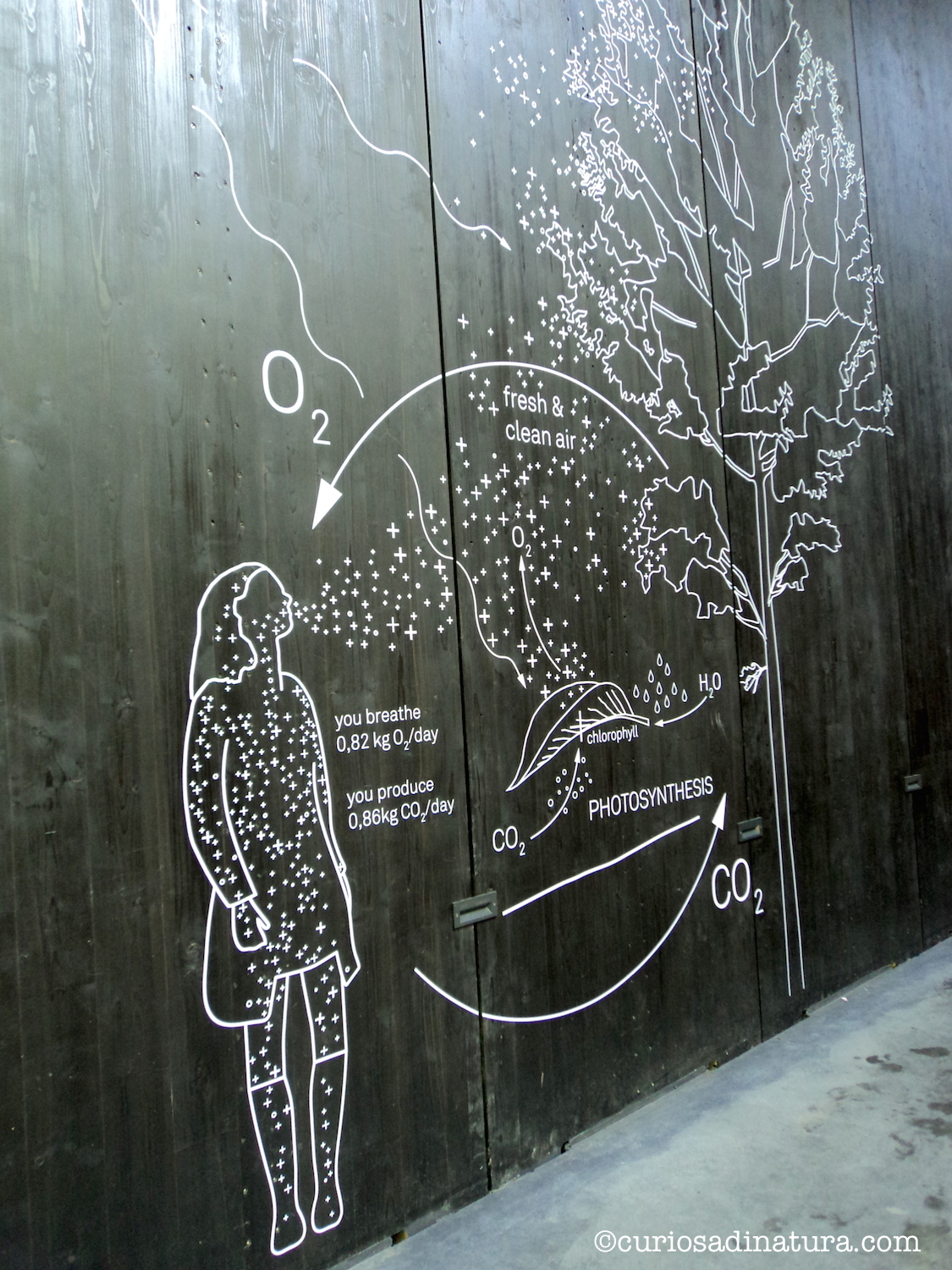 Tutti gli esseri vivi respirano: noi, gli animali e le piante. E la respirazione delle piante e la fotosintesi sono spiegate qui con bellissimi pannelli. In questa area, la superficie fogliare complessiva è pari a 43 200 metri quadrati. Da questo bosco vengono prodotti 62,5 chilogrammi di ossigeno all’ora e si assorbono 92 chilogrammi di anidride carbonica al giorno. Un equilibrio quasi perfetto tra la fotosintesi e la respirazione delle piante e la respirazione degli esseri umani che entrano a visitare il padiglione austriaco.