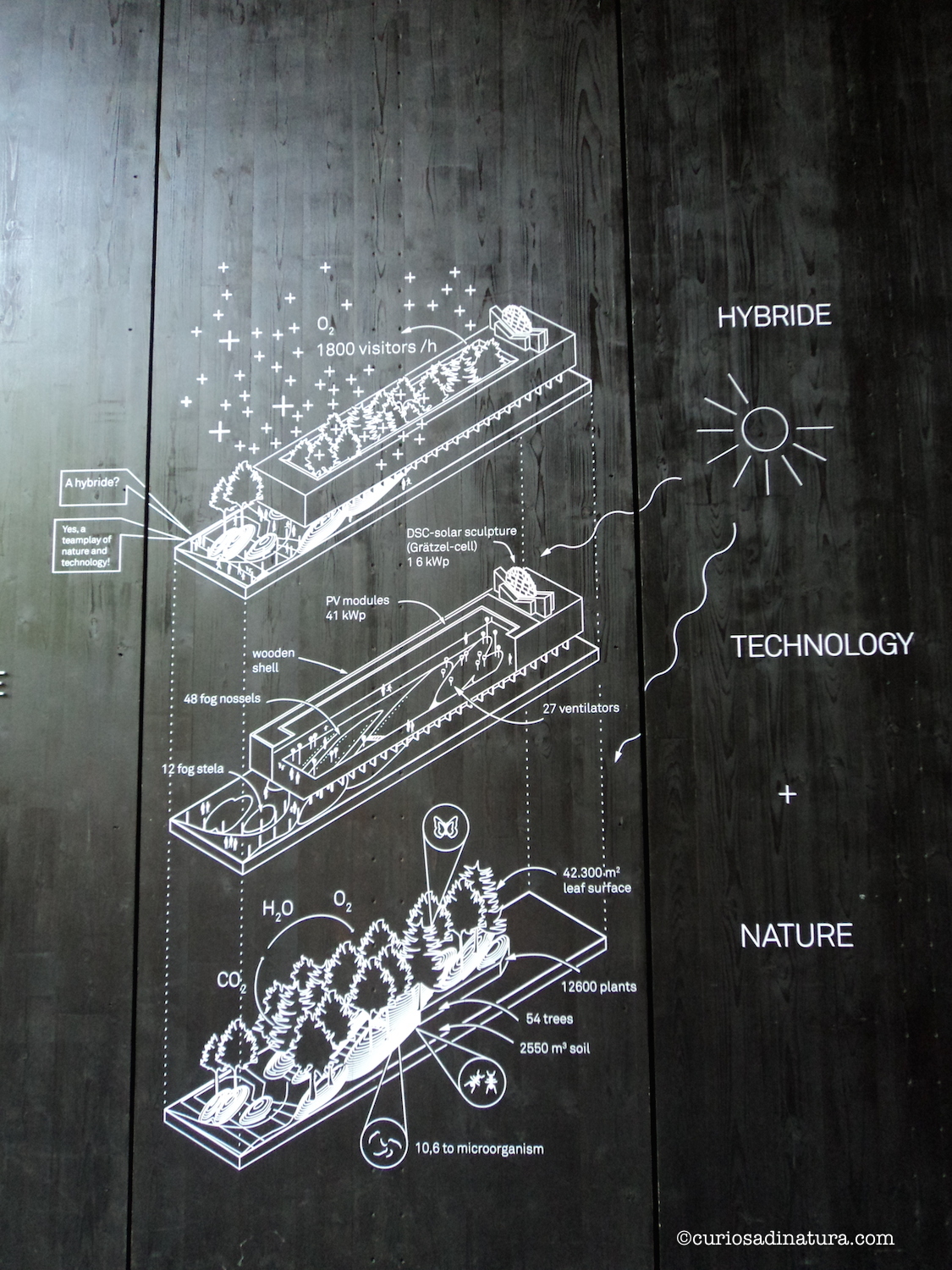 Un padiglione energicamente autosufficiente. Tutti gli organismi vegetali del bosco, dalle grandi piante ai piccoli fili di erba, concorrono con la fotosintesi a produrre ossigeno ed eliminare anidride carbonica. Ventilatori e nebulizzatori amplificano il lavoro dei vegetali. Inoltre, nel padiglione sono installati pannelli fotovoltaici e celle solari a colorante (celle di Grätzel) che possono produrre energia dalla luce secondo il principio della fotosintesi.