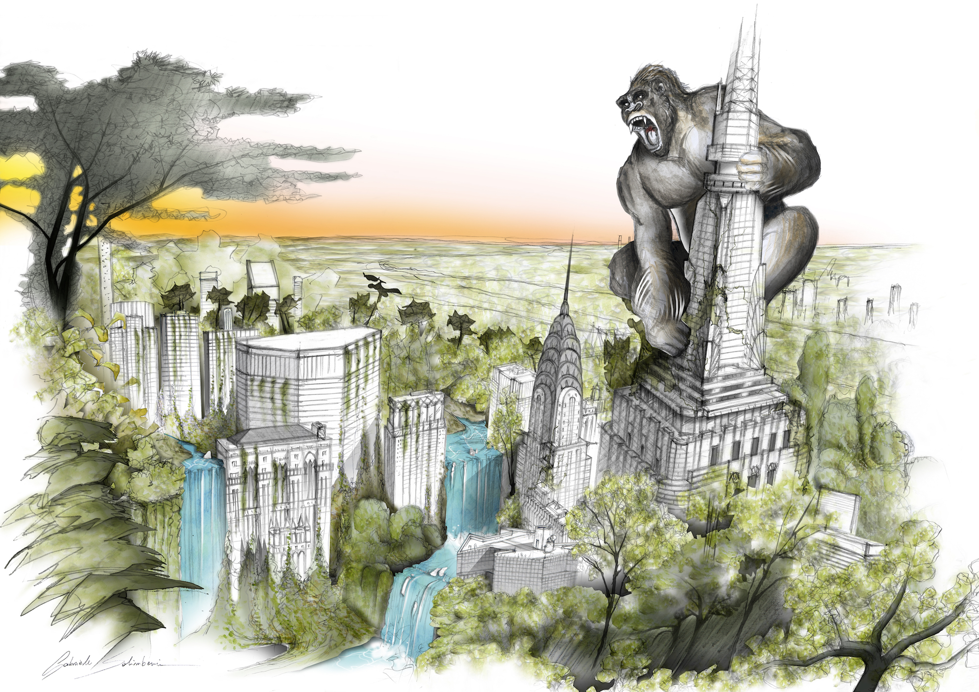 La New York del film King Kong potrebbe essere molto diversa, vista alla luce del cambiamento climatico, come quella illustrata da Gabriele Salimbeni.