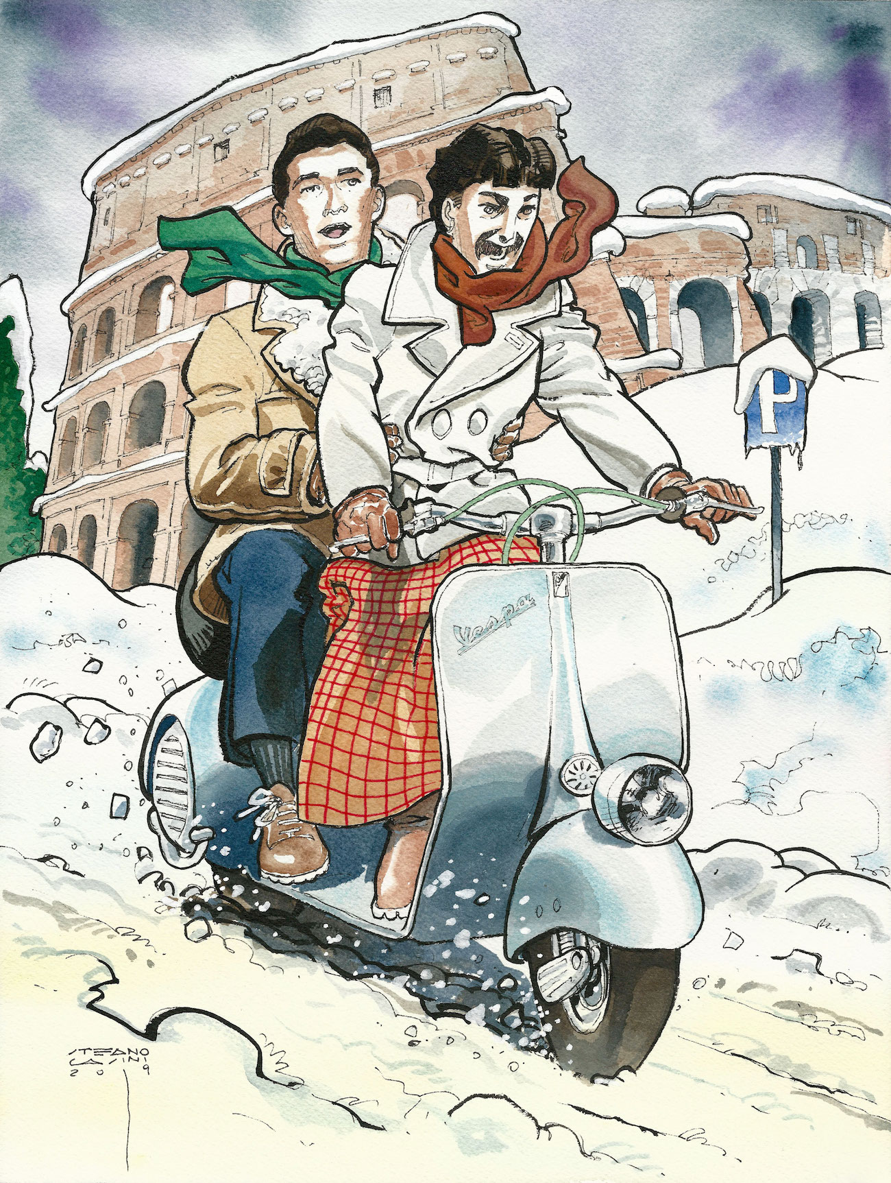 Le Vacanze romane di Audrey Hepburn e Gregory Peck nel futuro potrebbero essere rovinate da un clima decisamente polare, come nel fumetto di Stefano Casini.
