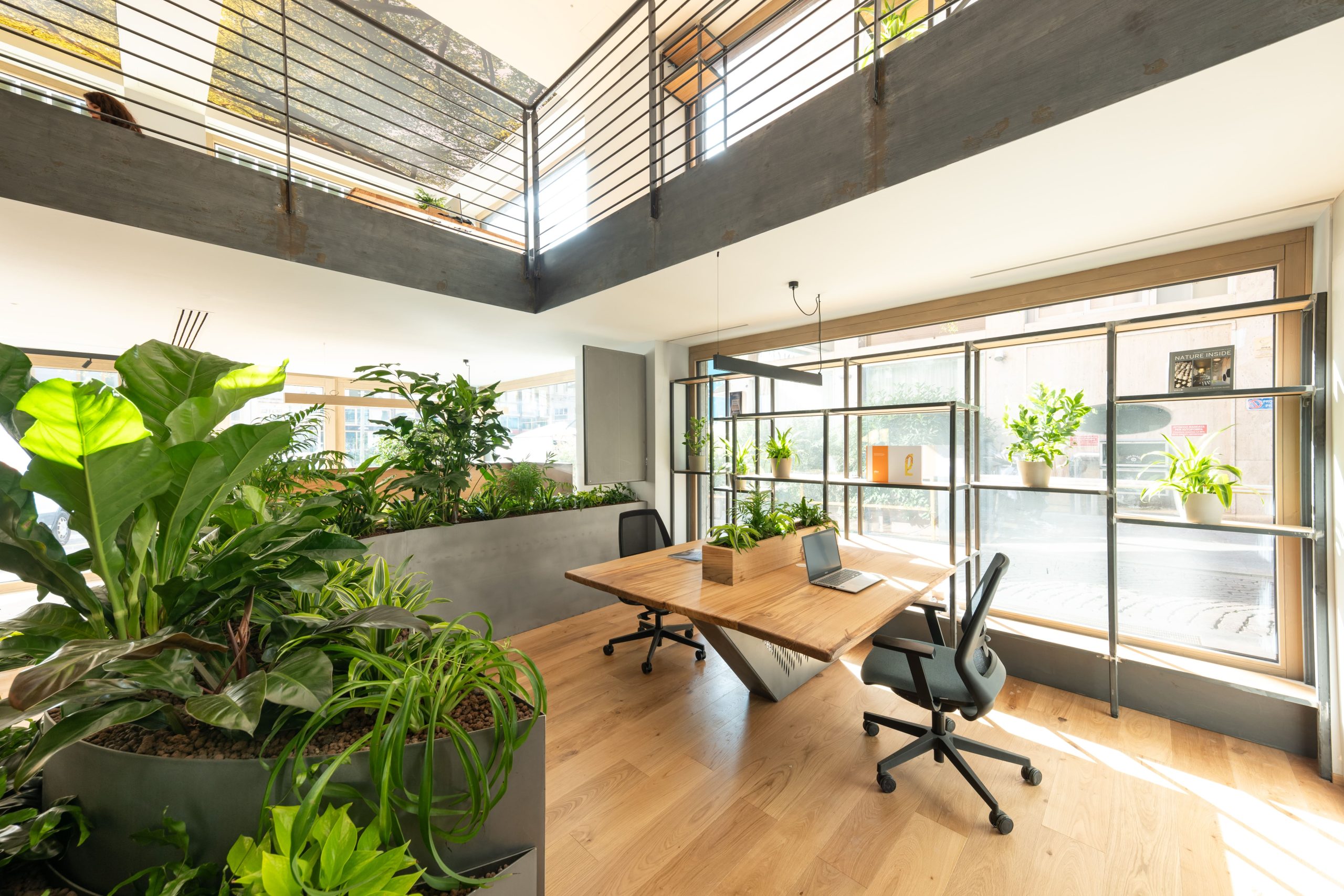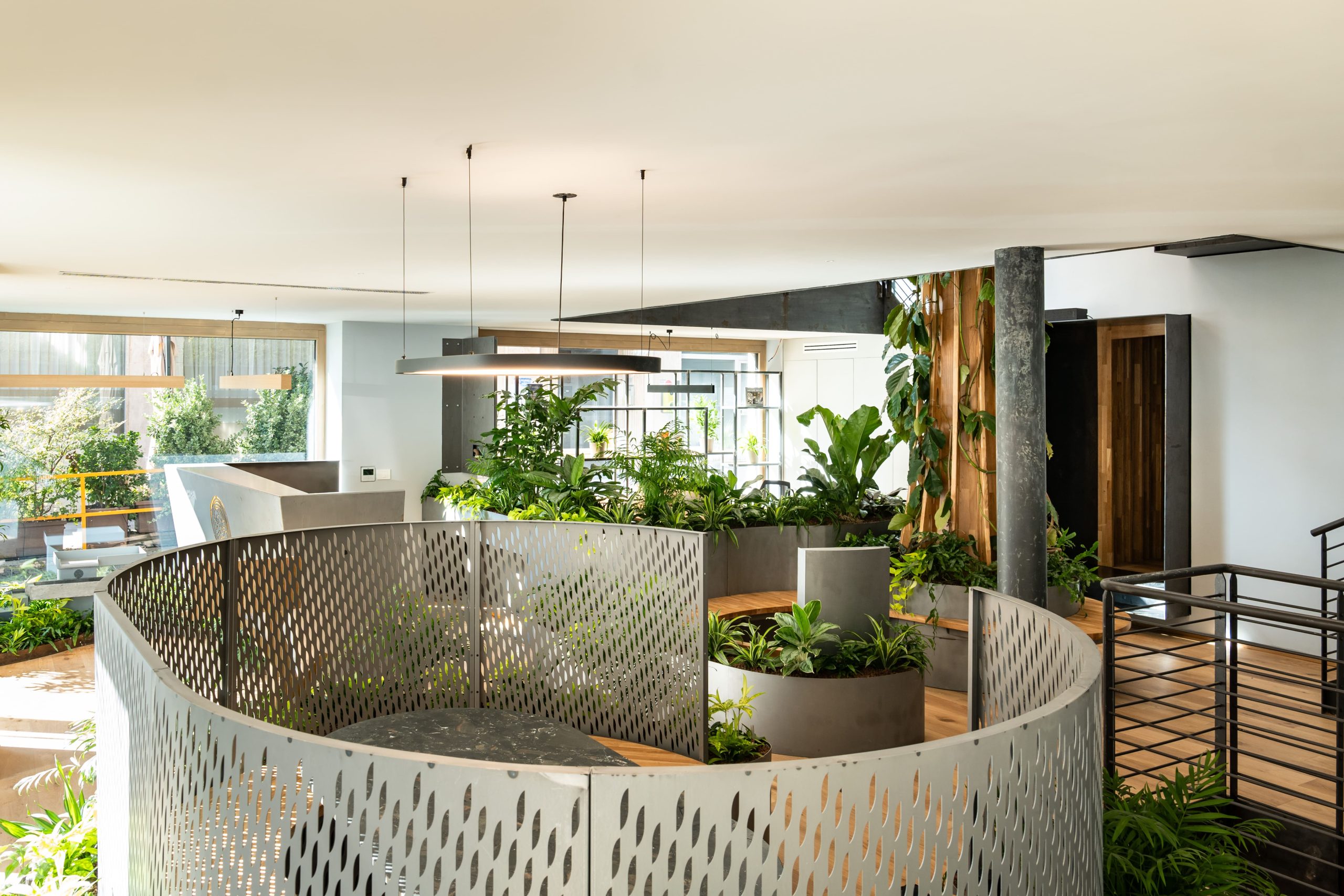 Negli uffici attorno all’open space troviamo un’altro elemento che caratterizza gli spazi biofilici: il concetto di pericolo. L’area di lavoro sembra fluttuare sopra al giardino interno e rende il luogo e l’atmosfera coinvolgenti. Gl uffici sono aperti e luminosi, ma allo stesso tempo i collaboratori possono usufruire di una zona di comfort e privacy.