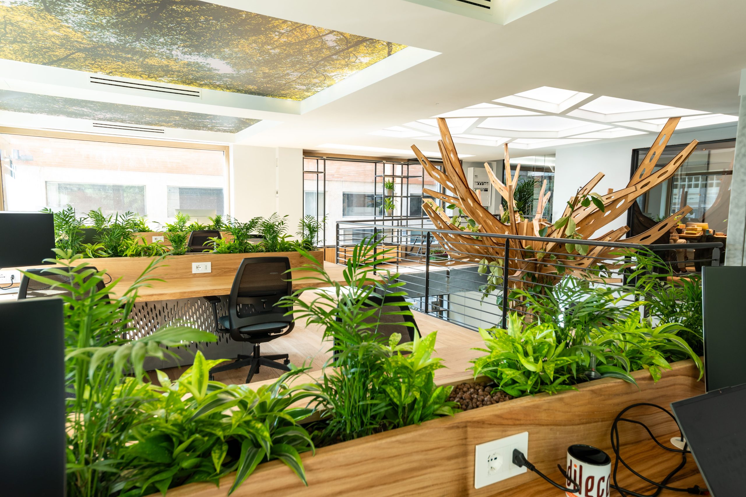 Alzando gli occhi, ecco che appare nella sua bellezza e maestosità l’albero in legno centrale sul quale vivono e si arrampicano numerose piante. L’albero è stato realizzato a mano dagli artigiani e tutte le sue parti sono state assemblate qui negli uffici, compresa la struttura interna in rame.